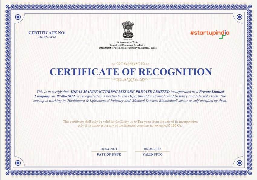 ನಮ್ಮ ಕಂಪನಿ ಭಾರತ ಸರ್ಕಾರದ ವಾಣಿಜ್ಯ ಮತ್ತು ಉದ್ಯಮ ಮಂತ್ರಾಲಯದಿಂದ "ಸ್ಟಾರ್ಟಪ್" ಎಂದು ಗುರುತಿಸಲ್ಪಟ್ಟಿದೆ.