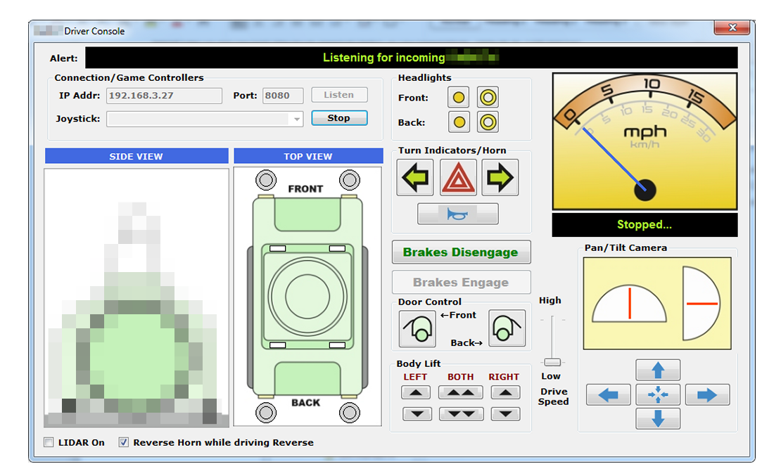was developed as part of a Remotely driven electric vehicle Technology Demonstrator. The ergonmic graphical software had a look and feel of a typical automobile console and similar buttons with additional EV specific features like Pan-Tilt control etc.