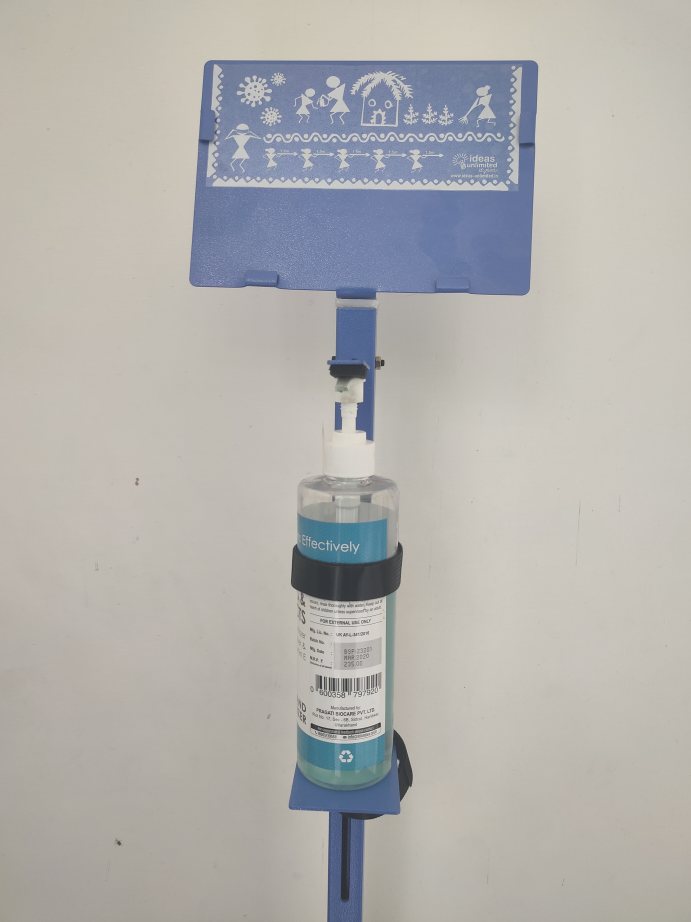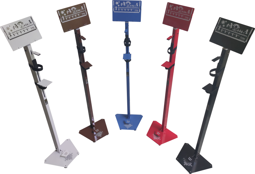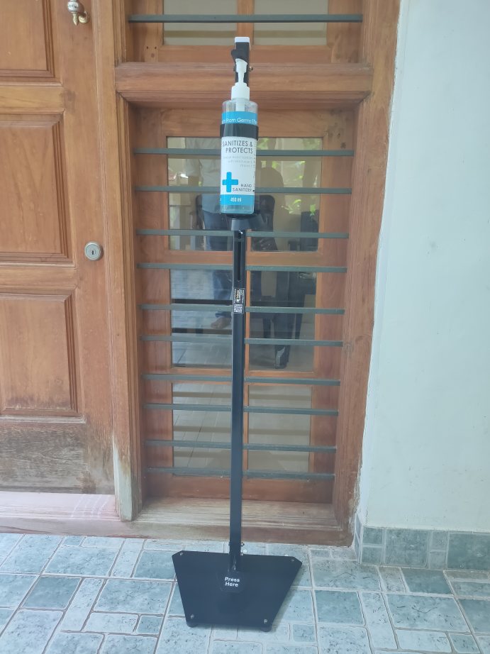This is a high quality aesthetically designed Sanitizer Dispenser stand. This was one of the first Covid-19 products launched by us. This stand helps to dispense sanitizer liquid with zero hand contact. This stand can fit any sized/shaped bottle with adjustable height bottle holder and high quality velcro to strap on to the bottle. This stand, unlike other ordinary stands can be adjusted to control the exact amount of liquid dispensed by adjusting the height of the bottle stand.
